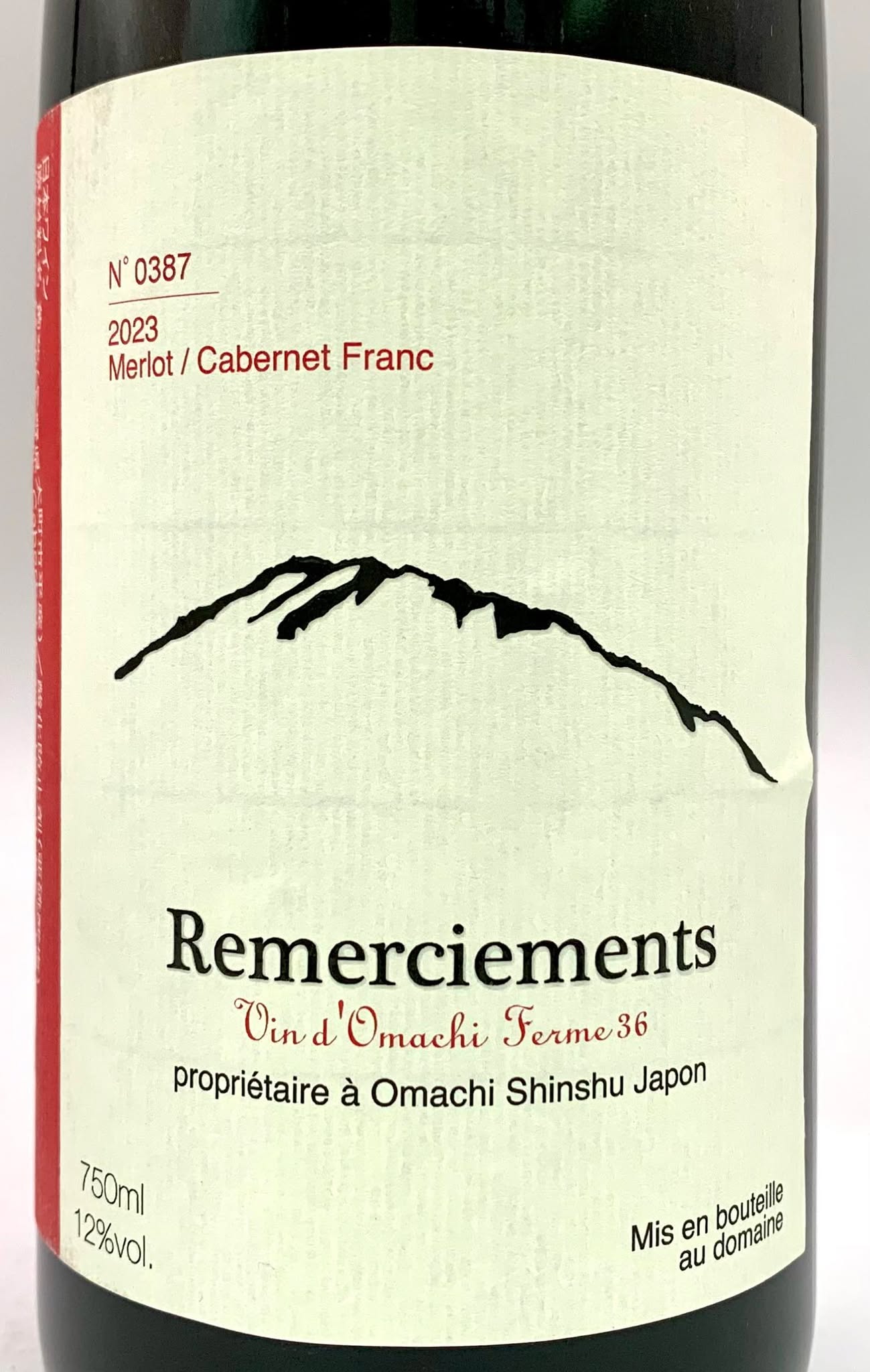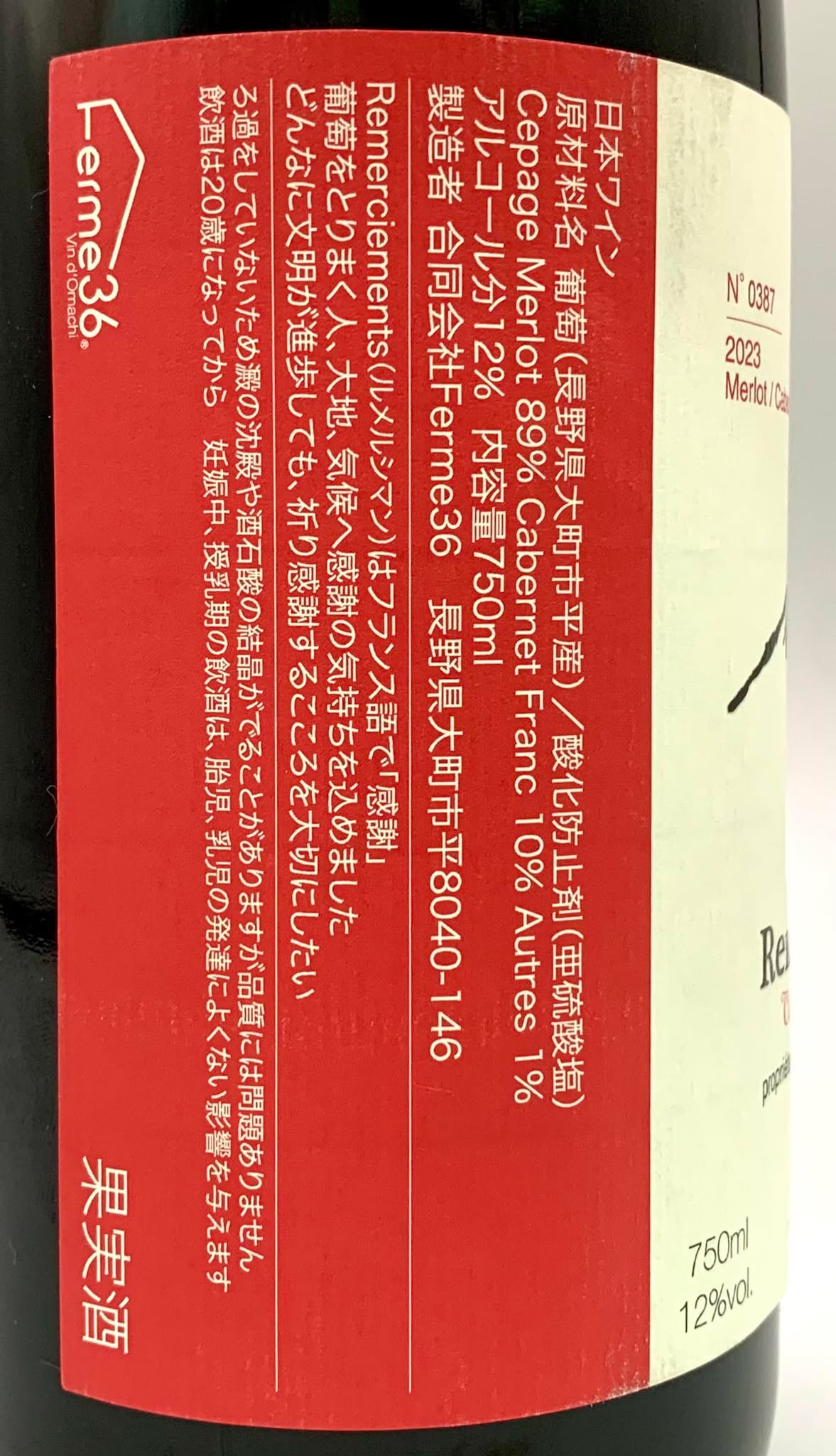 原料:大町市平野口·新郷産(自家栽培葡萄)メルロ種 89% カベルネ·フラン種 10% その他1%