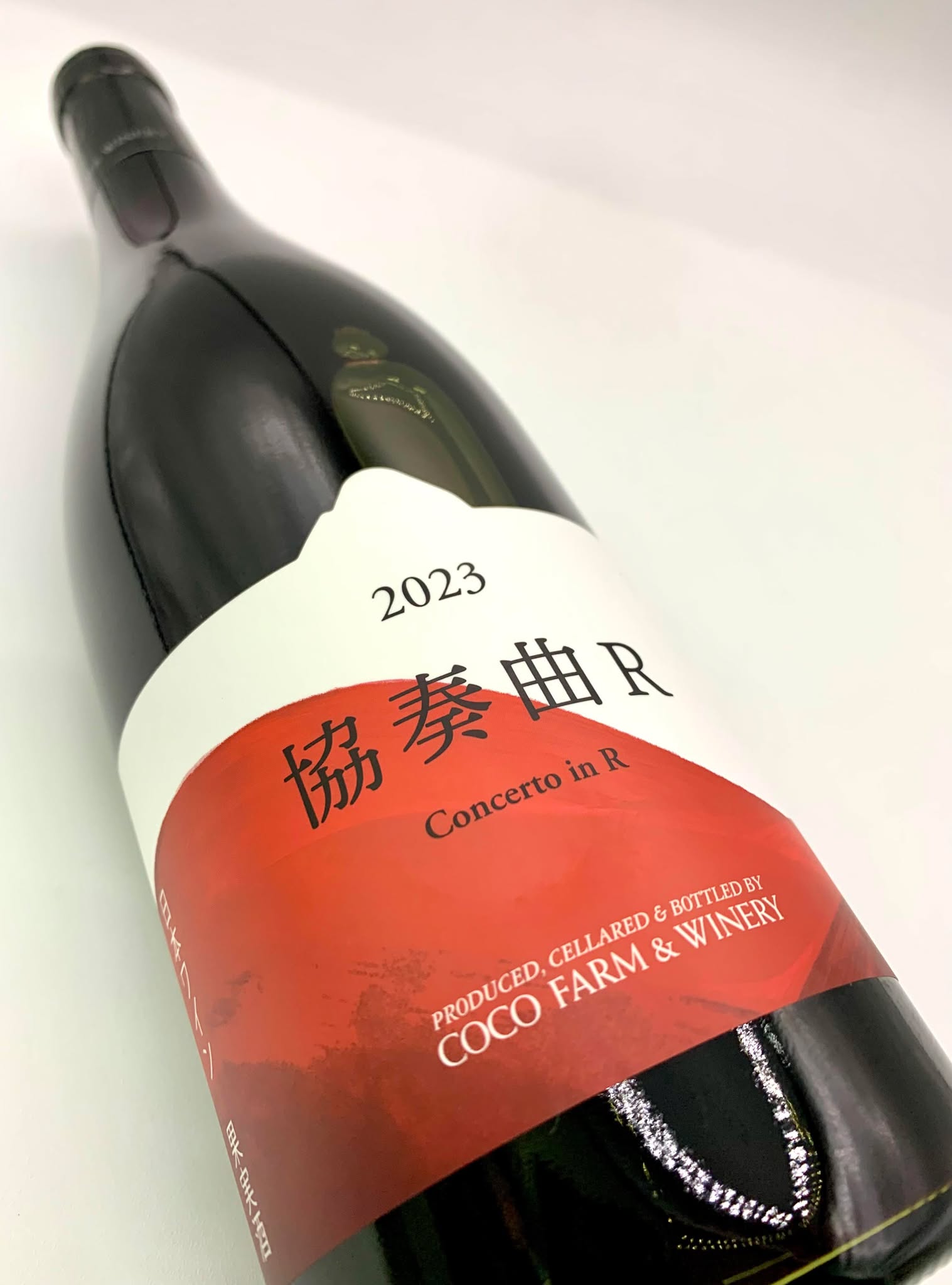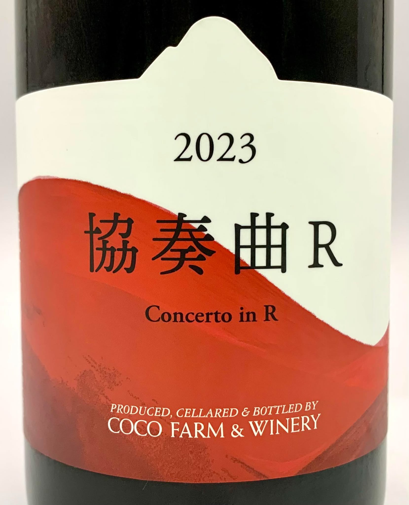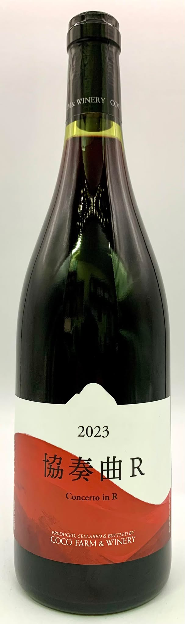 「協奏曲R」は、現在、急斜⾯の葡萄畑の中央で育てているノートン種(シンシアナ種)をはじめとして佐野市⾚⾒のタナ種、フリゼヴィンヤードのプティ・ヴェルドー種など、自家畑の⾚ワイン⽤葡萄品種からなるワインです。